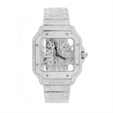 Discover our stunning Diamond Santos Skeleton 40mm in Stainless Steel. This Iced Out Cartier watch is flawlessly diamond set with over 2300 diamonds, for a carat weight of 21 carats of VS diamonds. The craftsmanship is at its finest on this Cartier diamond watch, with a splendid flowersetting, making it fully covered of diamonds, without any visible gap or metal parts.