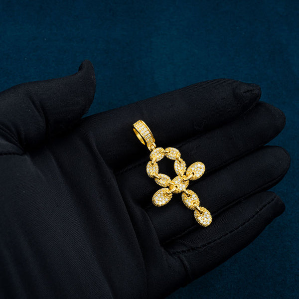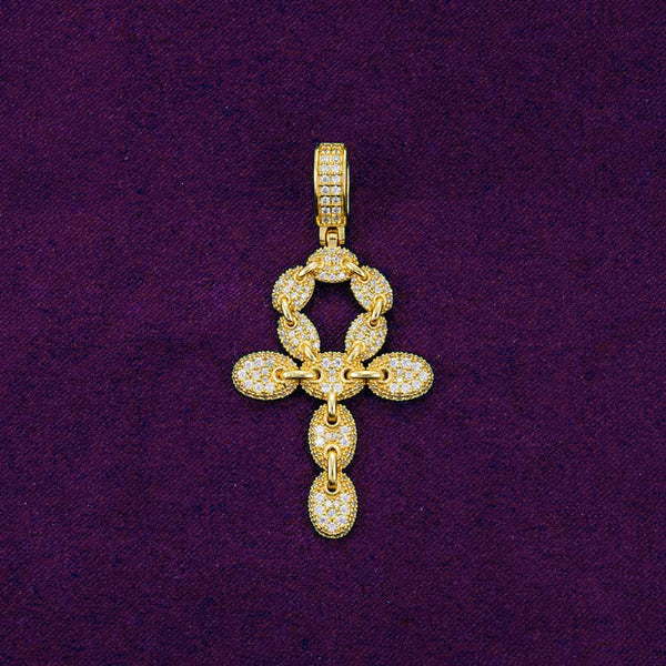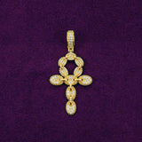 This men's Moissanite Ankh Pendant is made with a solid base of 925 sterling silver and iced out with round cut, D-color VVS moissanite diamonds, all of which are placed in a pave setting.