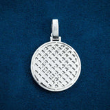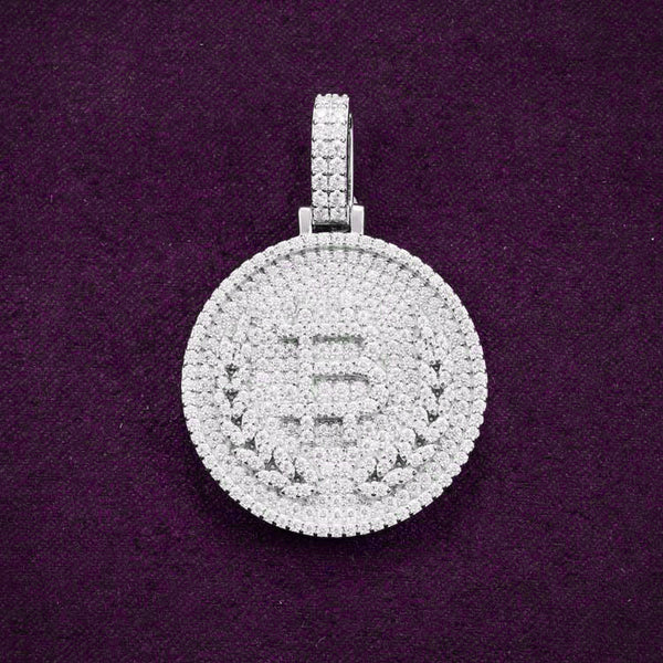 This mens Moissanite Bitcoin Pendant is made with a solid base of 925 sterling silver and iced out with round cut, D-color VVS moissanite diamonds, all of which are placed in a pave setting.